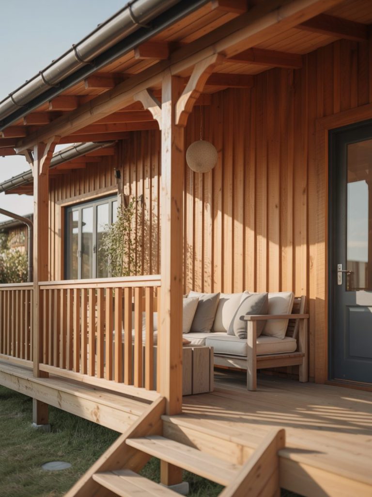 Natural wood railings create that cozy, grounded feeling that makes you want to linger longer. Cedar or pressure-treated pine works beautifully for this look. Skip glossy finishes — matte stains age far more gracefully.