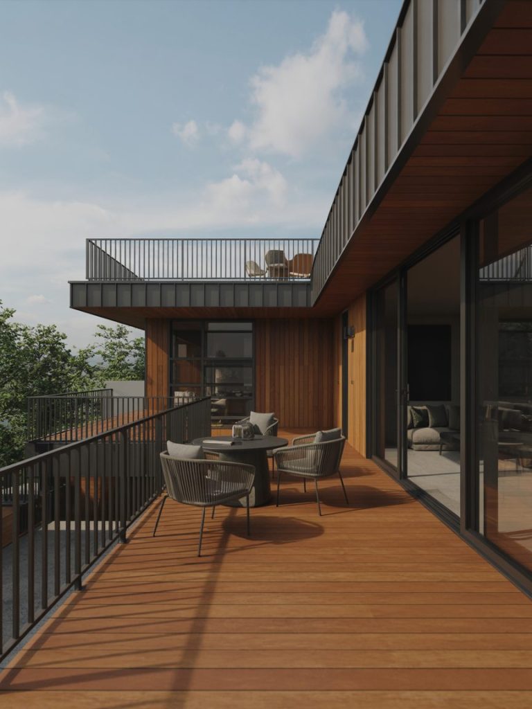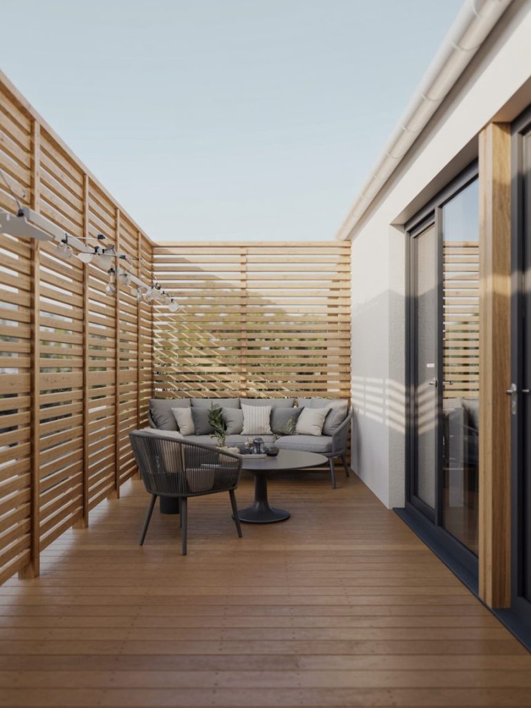 Horizontal railing lines visually stretch your space, especially helpful for small deck ideas. Light oak or soft gray tones keep it airy. Too many slats can feel busy, so keep spacing intentional.