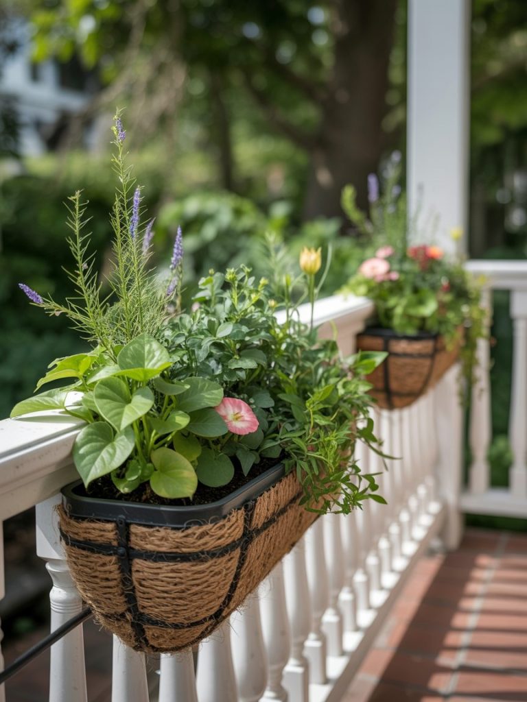 Adding slim planter boxes directly to your railing brings life right to eye level. Herbs, trailing ivy, or small flowers all work beautifully. Don’t overcrowd — plants need breathing space too.
