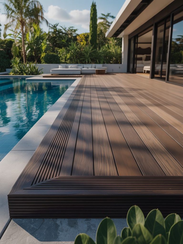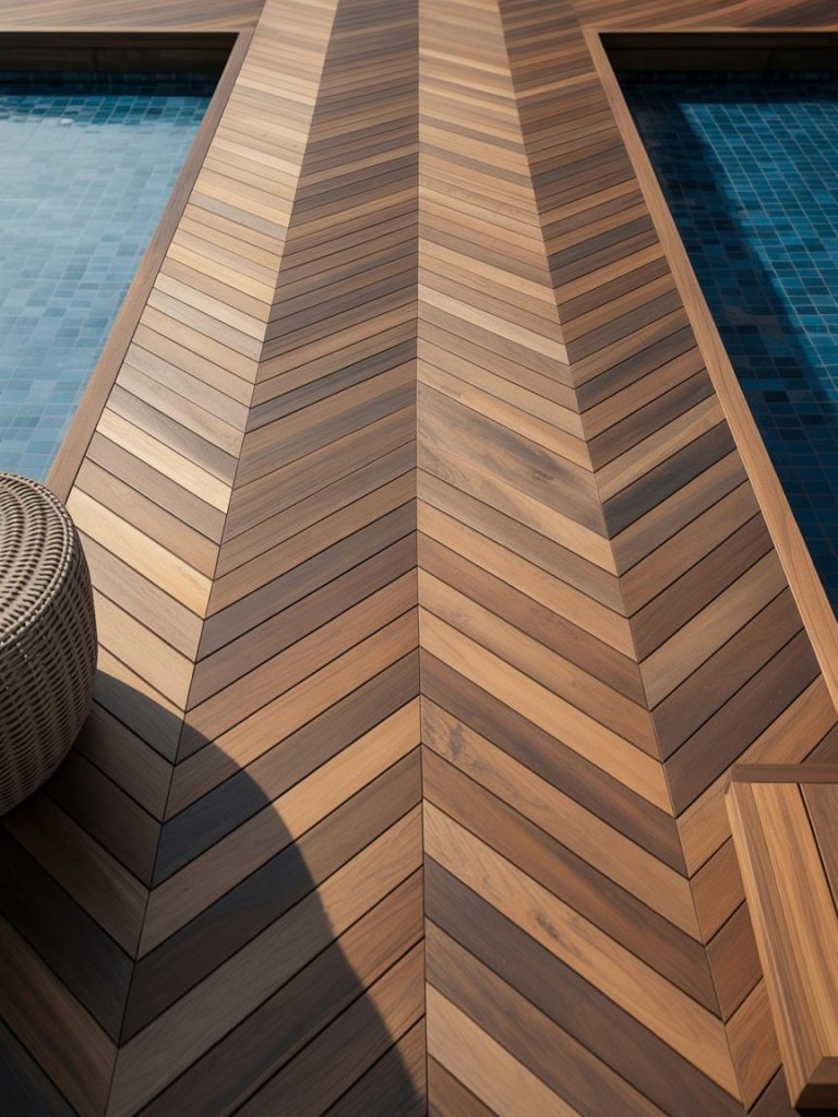 Mixing two wood tones — like deep walnut and soft beige — creates subtle dimension underfoot. It works especially well in larger outdoor deck design layouts. Keep the contrast gentle or it starts looking striped.