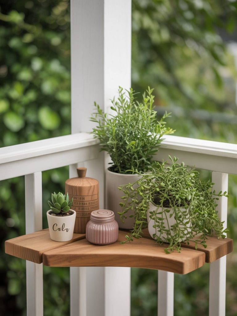 Adding a small corner shelf to your railing gives you space for plants or decor. Think of it like outdoor wall decor ideas but functional. Keep it minimal — clutter shows fast outdoors.