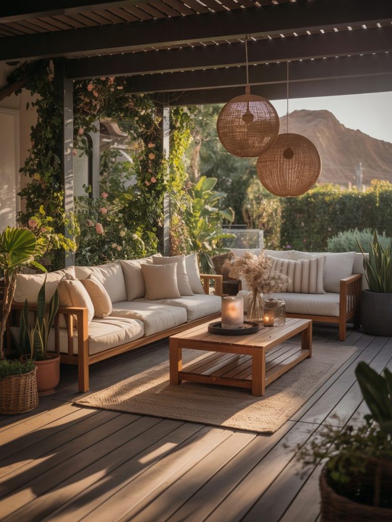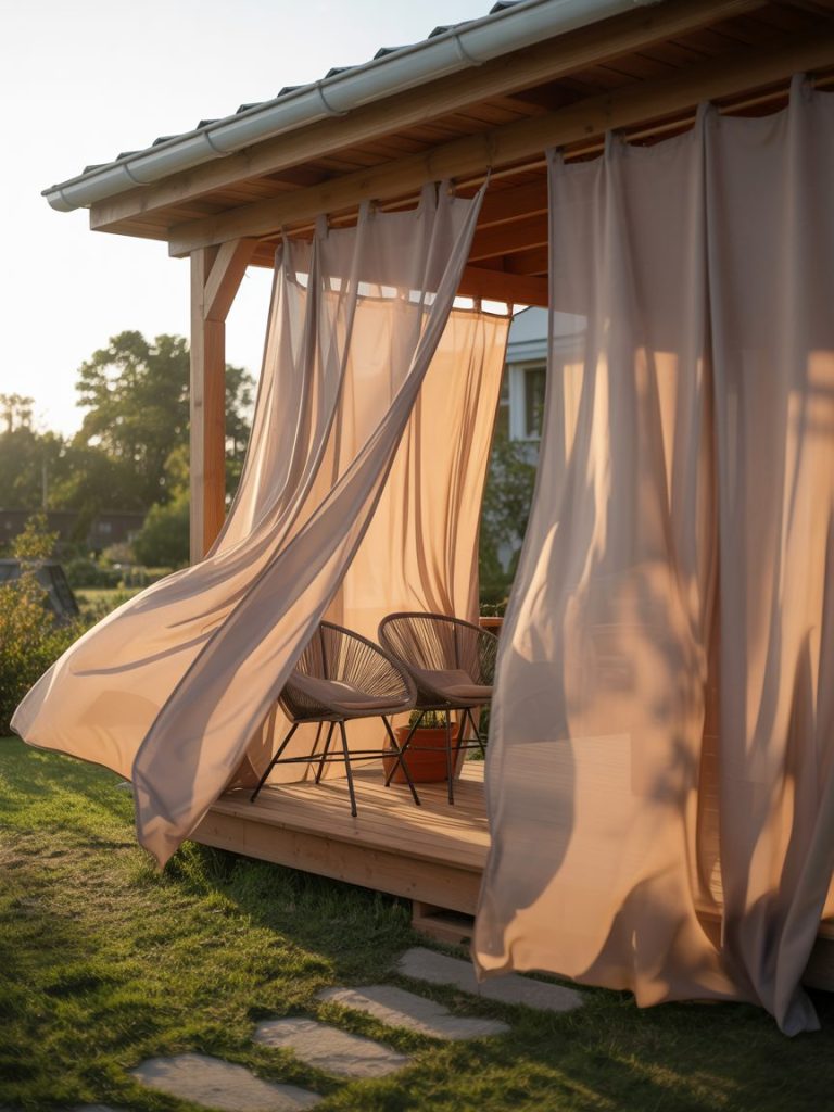 Light outdoor curtains add softness and privacy. They instantly make the space feel like a retreat. Secure them well — wind can turn them into chaos.
