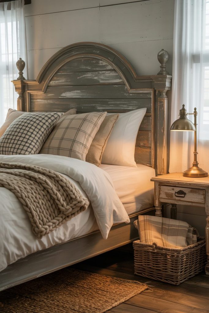 Want that cozy farmhouse feel? A greywashed wooden headboard brings rustic charm with a modern twist.
