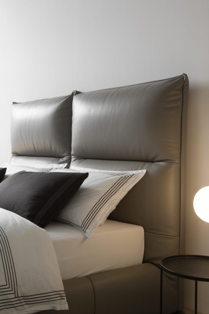 For those who love clean lines and modern vibes, a grey leather headboard is a sleek option. It’s easy to wipe clean and adds a subtle luxe feel.