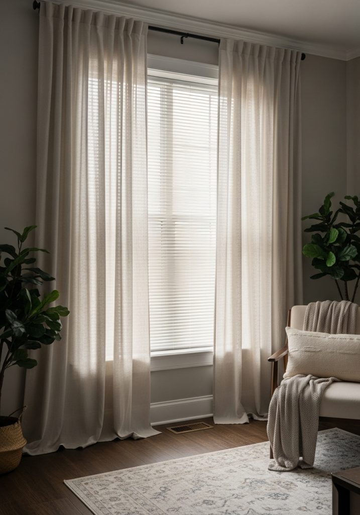 Stick to neutral, textured fabrics like linen or cotton blends. For more on fabric choices and lengths, look into living room curtains ideas.