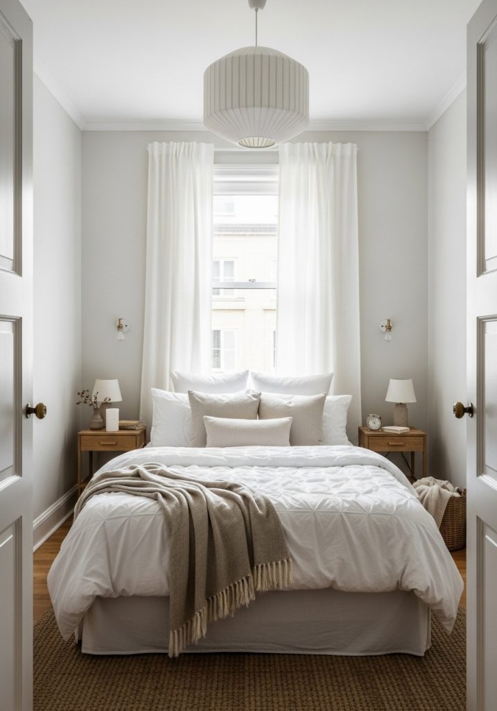 You don’t need a new bed frame to upgrade the look. Crisp white sheets and a textured duvet cover can make a cheap mattress feel like a hotel bed. Layering is key here.