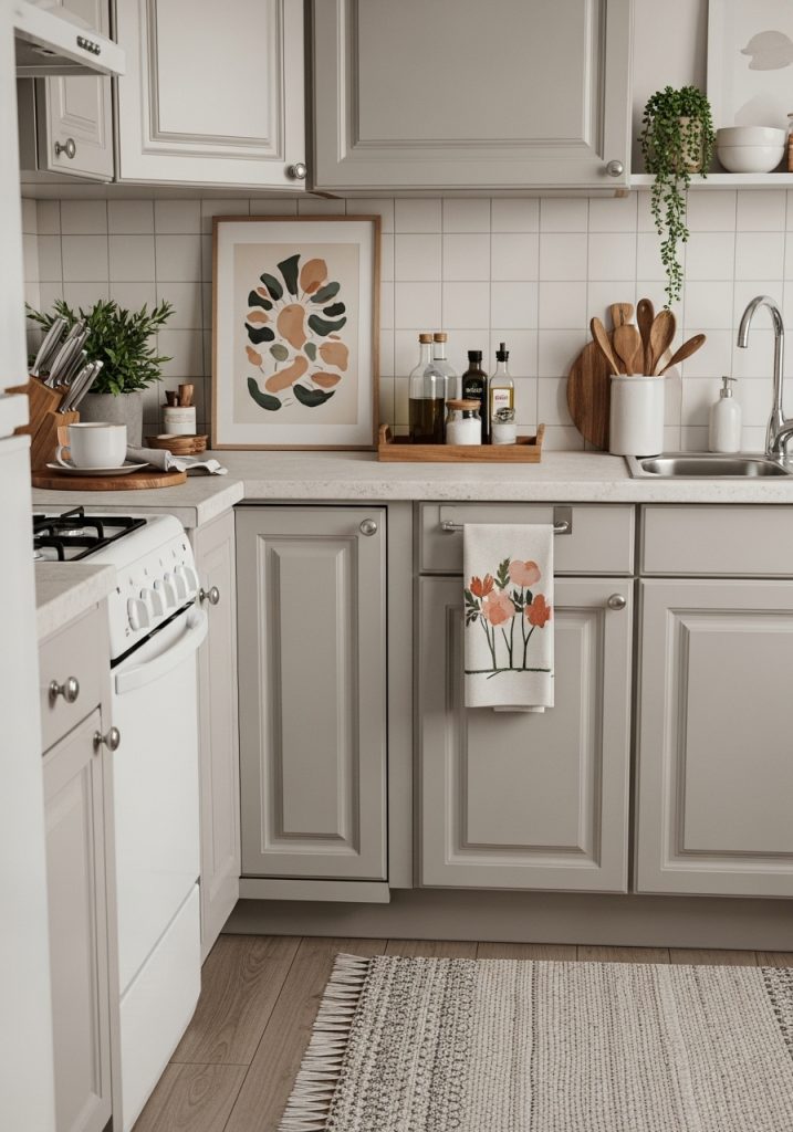 Lean a small piece of art on the counter. Use a nice wooden tray to corral your oil and vinegar. These small touches make it feel designed.