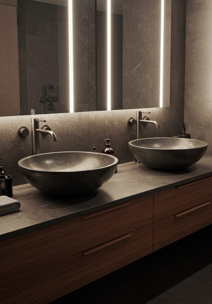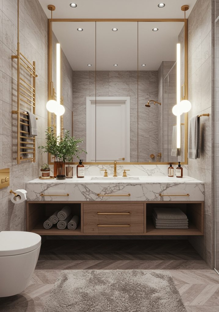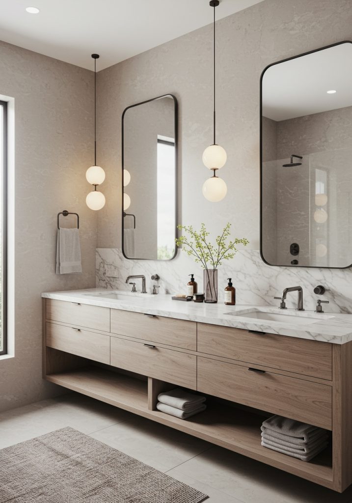 - Lighting matters! Layer mirror lights with overheads for spa vibes.