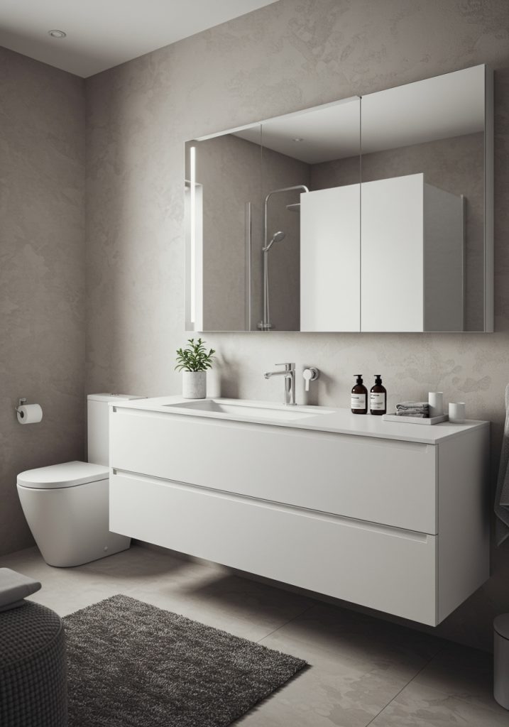 If you love uncluttered spaces, a minimalist bathroom vanity will fit right in. Think clean lines, neutral colors, and hidden storage.