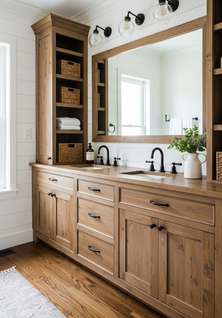 You don’t need a barn to create farmhouse vanity style. Try wood textures, shiplap, and matte finishes.