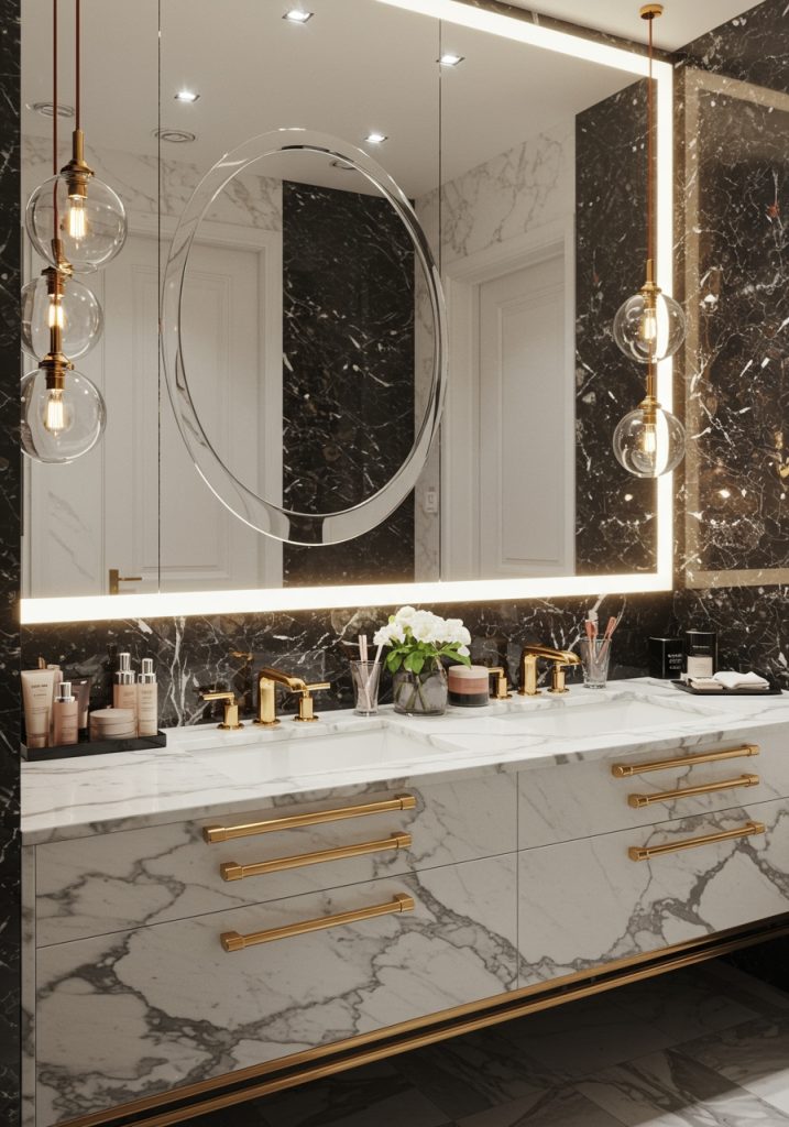 Craving sparkle in your daily routine? Glam vanities use marble surfaces and shiny metallic hardware. It’s like getting ready at a high-end hotel—minus the room service.