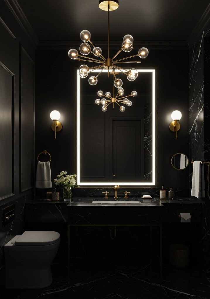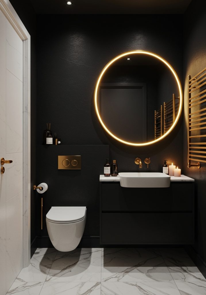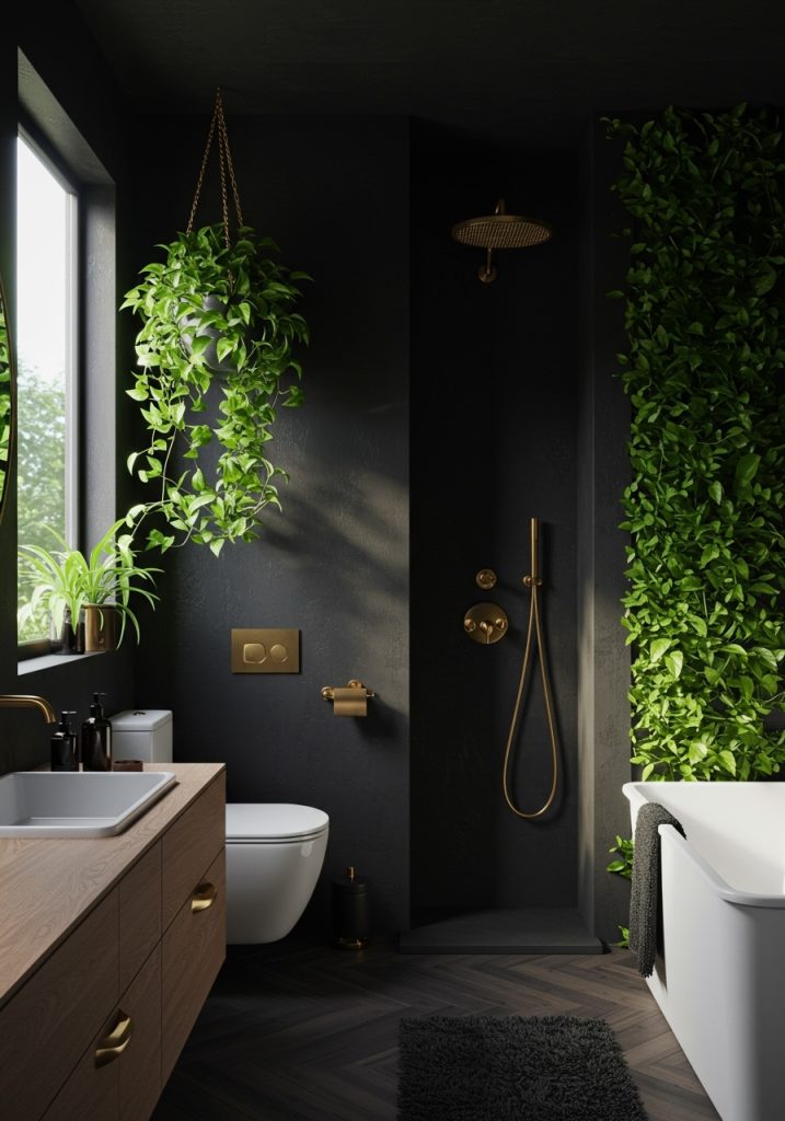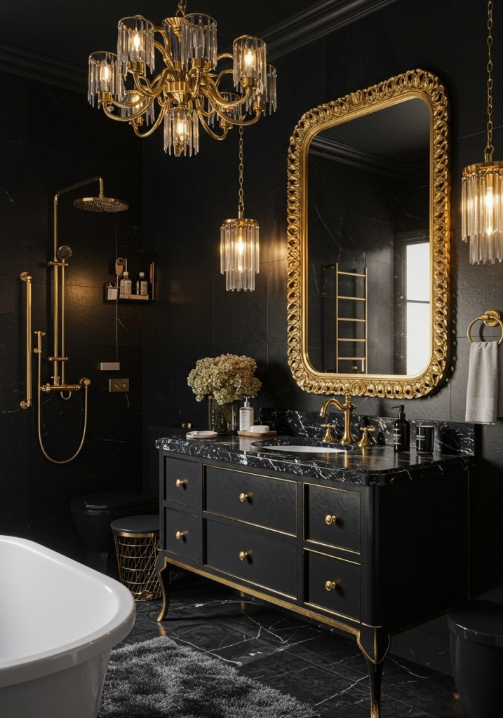 Black and gold? Chef’s kiss. While matte black fixtures are modern and sleek, brass or gold fixtures against a black backdrop are pure, old-school glamour. A black vanity with gold pulls and a gold-framed mirror? Yes, please. It feels less industrial and more like a luxury hotel.