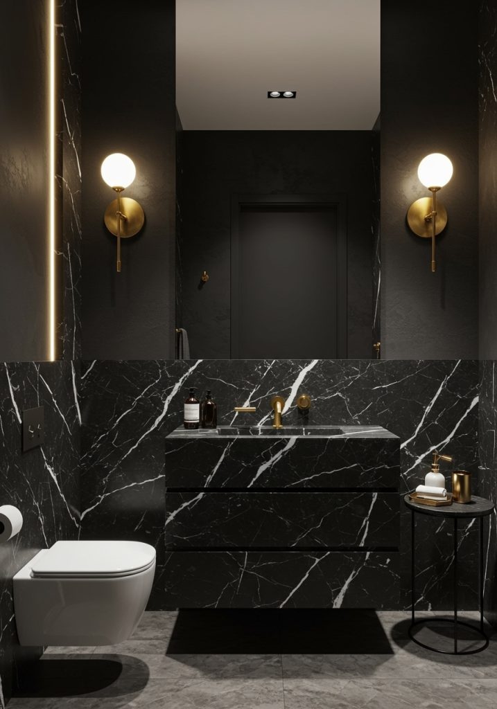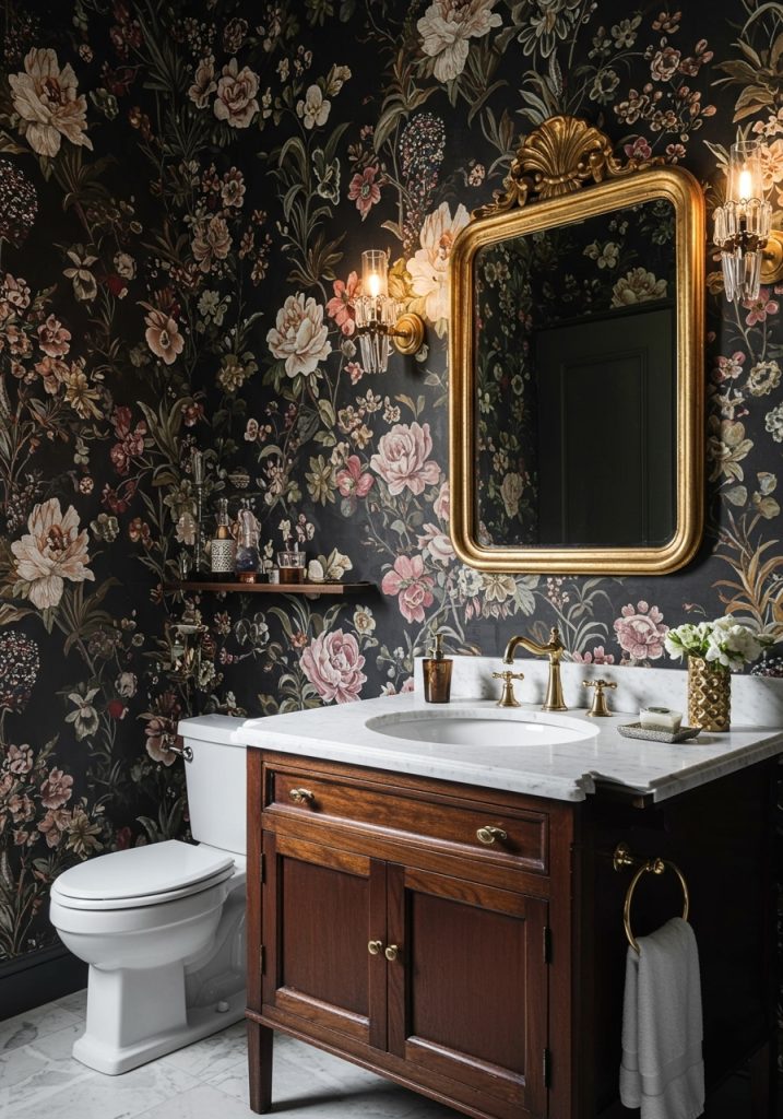 Who says black has to be solid? A black-based wallpaper with a cool pattern—like a gold art-deco geometric, a lush floral, or a subtle damask—is unbelievably chic. It adds texture and personality, making the bathroom feel like a custom-designed jewel box.