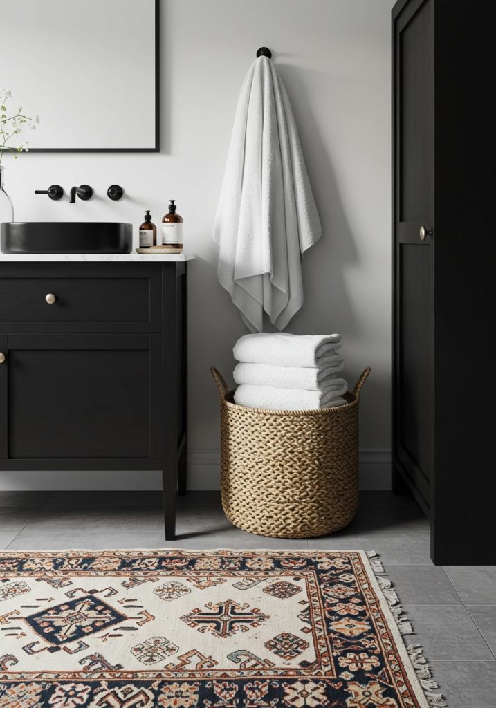 This is the easiest part! Plush, fluffy towels and a soft bath mat are essential for softening the hard lines of a bathroom. A set of jet-black towels looks incredibly sleek. Or, for that spa-like contrast, use crisp, hotel-quality white towels. A Turkish-style rug can also add a great pop of pattern and texture.