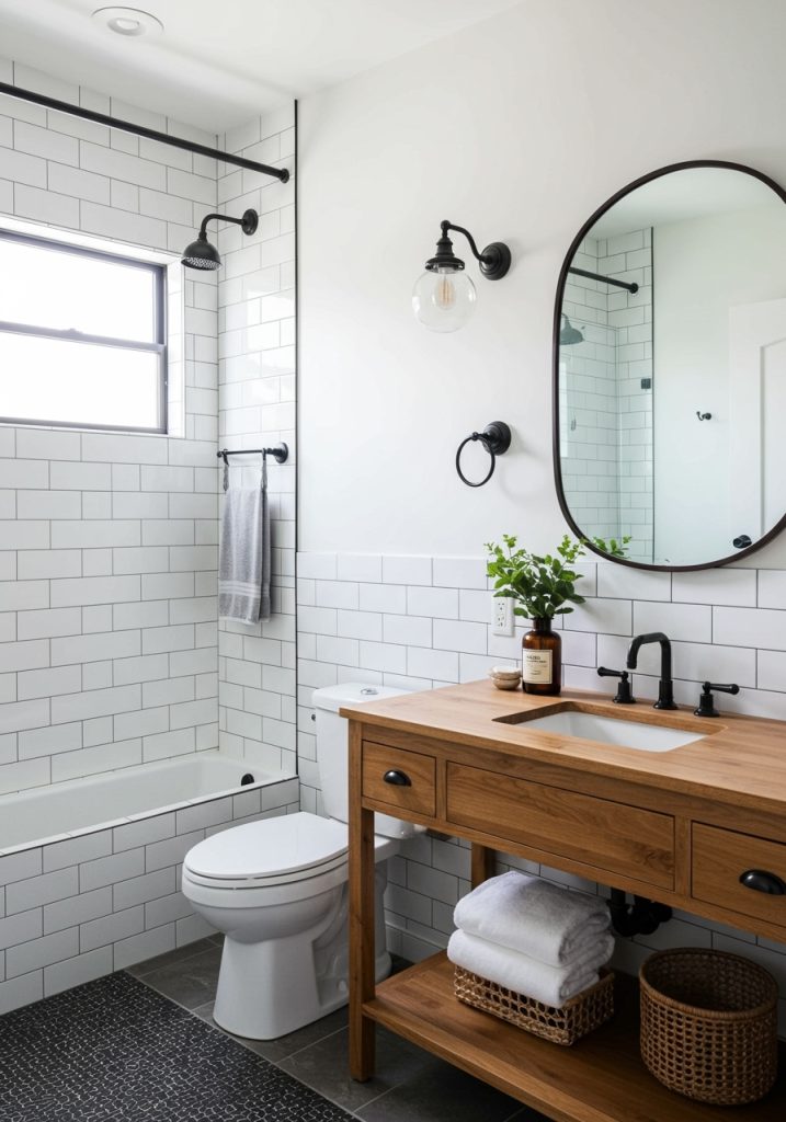 Can’t decide? Do both. Paint the top half of your walls black (or use black tile) and install a crisp white wainscoting or beadboard on the bottom half. This gives you that moody, dramatic feeling up top but keeps the space feeling bright and grounded. It’s the best of both worlds, and we’ve got a ton of inspiration for white and black bathroom ideas if you love this high-contrast look.