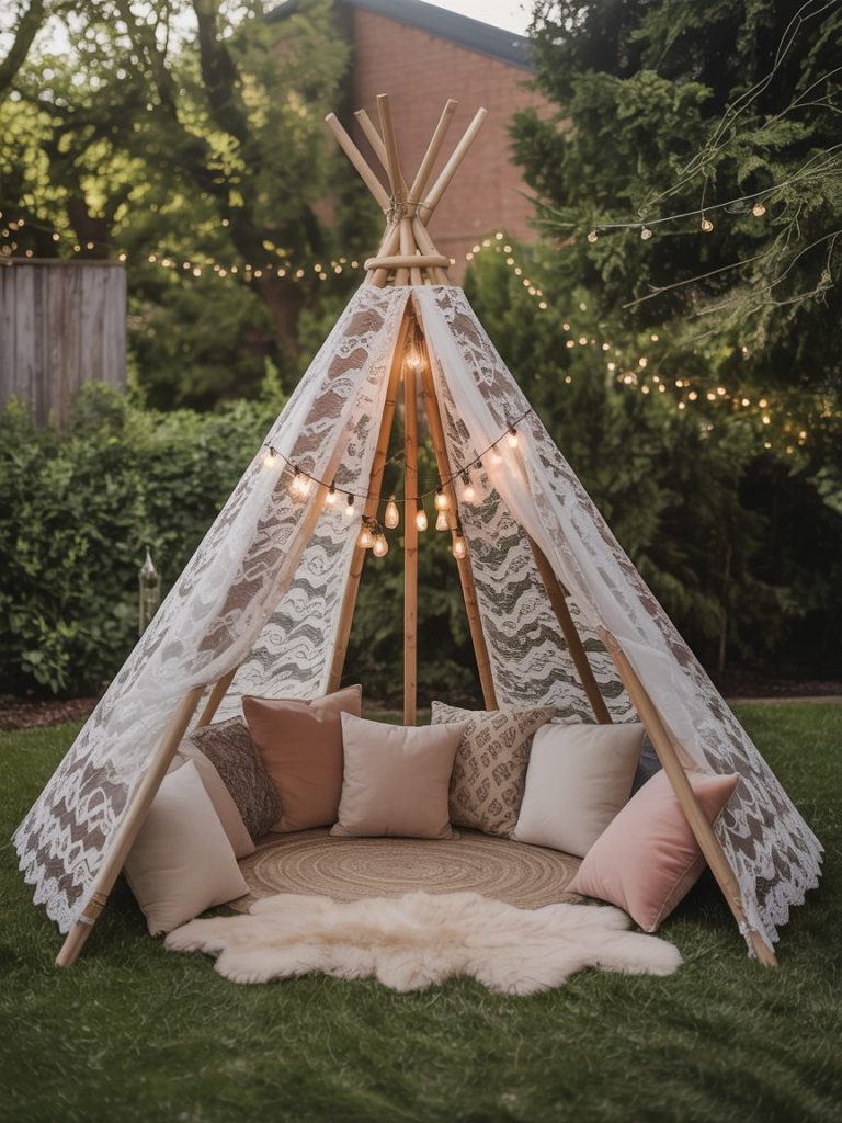 Construct a simple wooden tripod tipi and drape it with lace or sheer fabric. Throw in some decorative vases filled with feathers and pampas grass to create a “chill zone” that doubles as a backdrop for pictures.