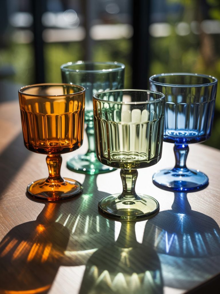 Amber, sage green, and smoky blue glasses catch the sunlight beautifully. These color palette ideas can help you decide which hues will harmonize with your garden’s natural flowers.