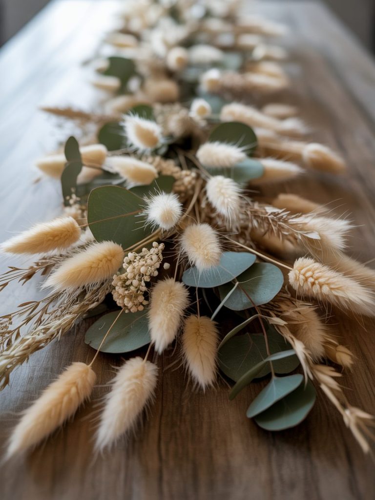 Instead of fresh bouquets that wilt in the heat, use a runner of dried pampas grass, eucalyptus, and bunny tails. It’s a very “boho-chic” look that lasts all day and night.