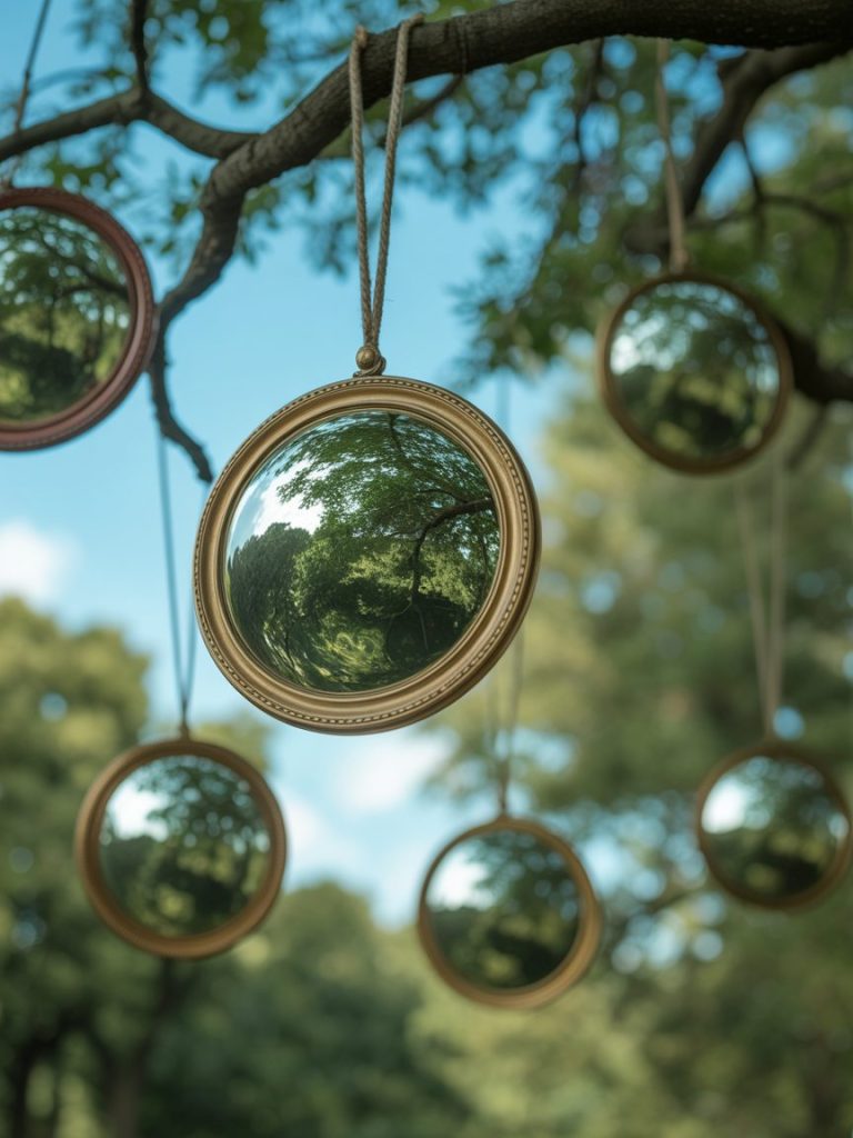 Hanging small, vintage mirrors from trees can reflect the greenery and light, making a small garden feel much larger. For more tips on using reflective surfaces, check out these mirror wall decor ideas.