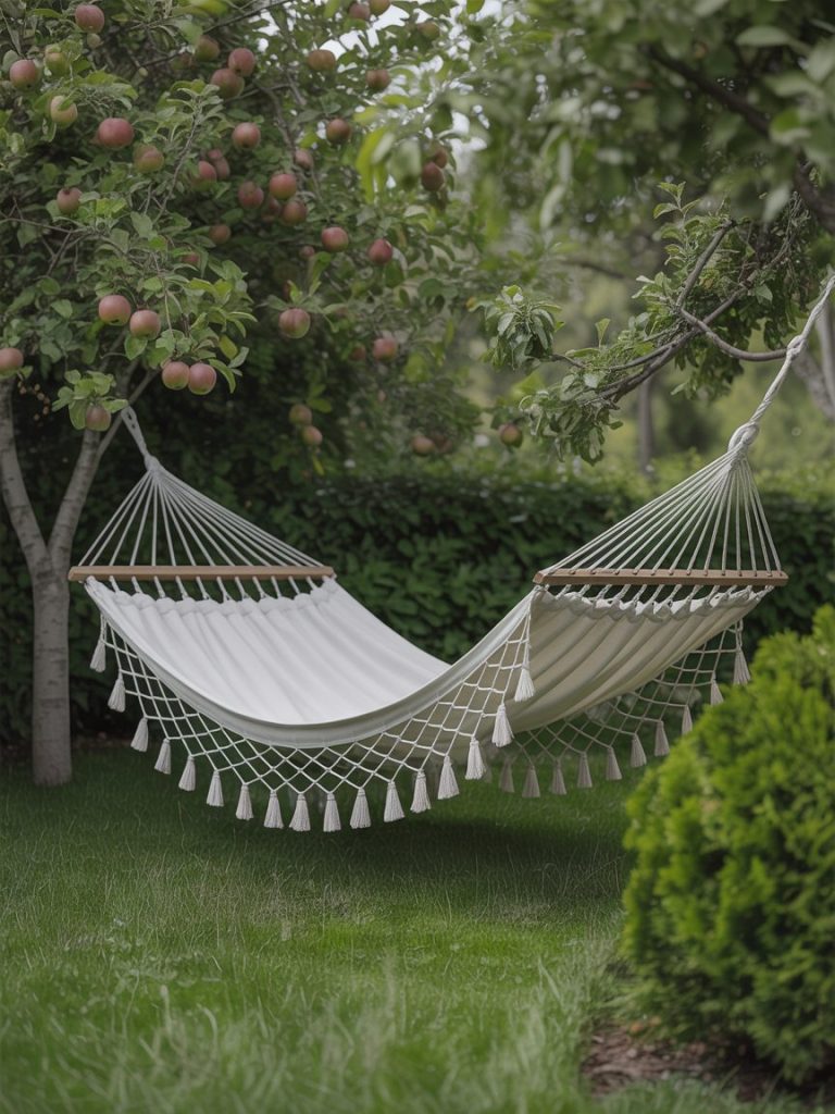 If you have the space, string up a tasseled cotton hammock between two trees. It’s the ultimate boho statement piece.