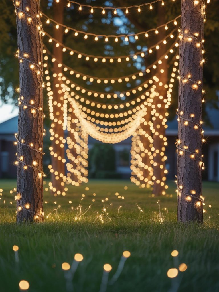 Wrap warm white fairy lights around tree trunks or drape them over the fence. They provide a twinkle that feels like lightning bugs in a jar.
