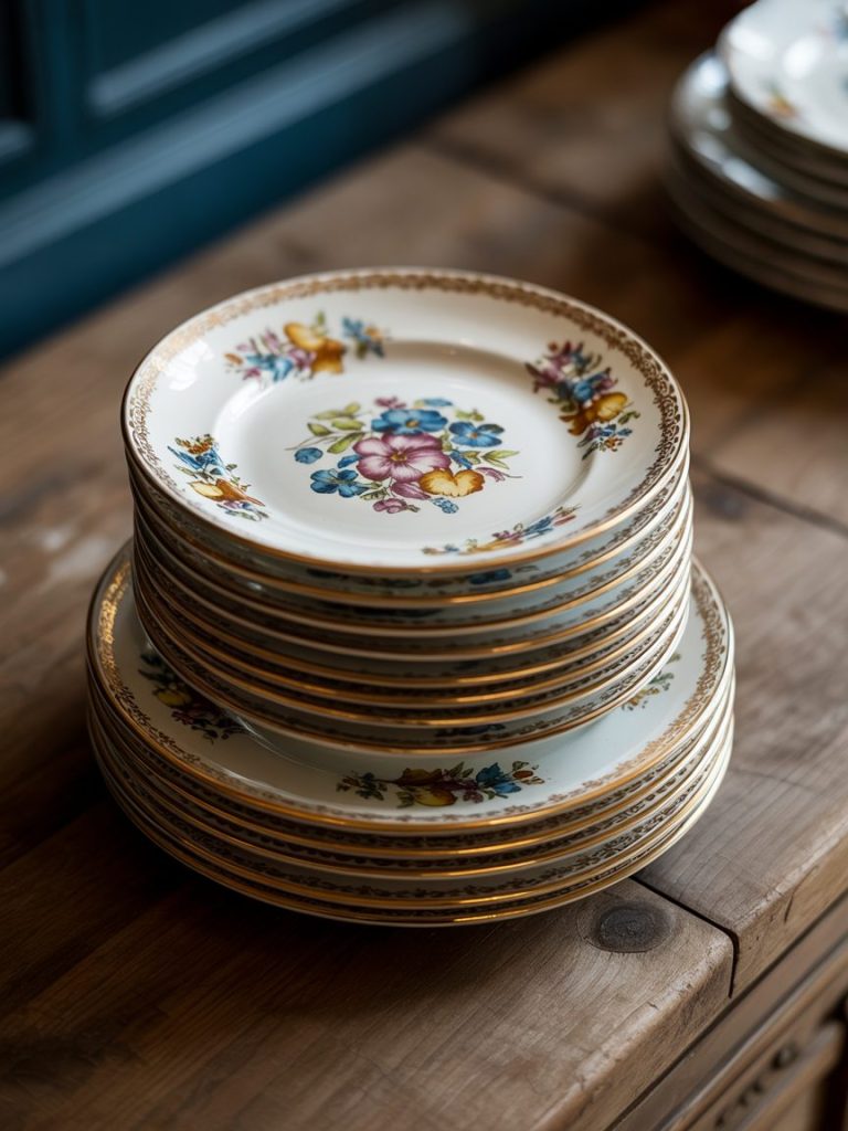 Scour thrift stores for floral plates with gold rims. Mixing patterns creates a storied, lived-in feel that perfectly suits a vintage garden decor theme.