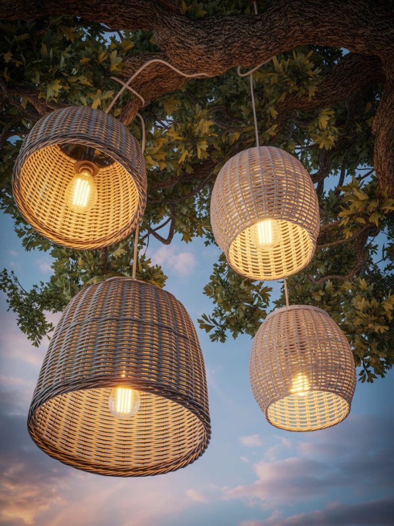 Hang large wicker or bamboo baskets from tree branches with Edison bulbs inside. It creates a stunning focal point and casts beautiful shadows across the grass.