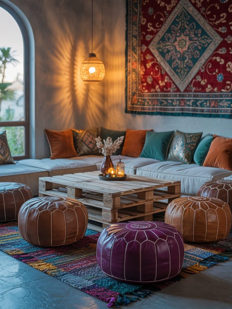 Scatter Moroccan leather poufs and velvet floor pillows around the low tables. This encourages a relaxed, “stay a while” atmosphere.