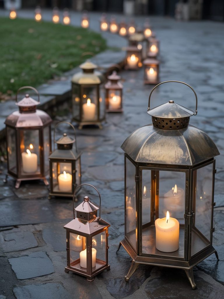 Line your walkway with aged brass lanterns. Mix and match different sizes and fill them with real wax candles or high-quality LED versions for safety.