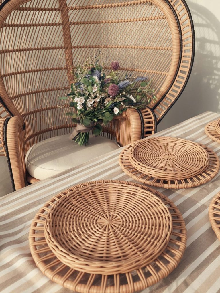 Rattan is staying huge in 2026. Incorporate rattan chargers for plates or even large rattan peacock chairs for the guests of honor. It adds a 70s flair that feels modern when paired with greenery.