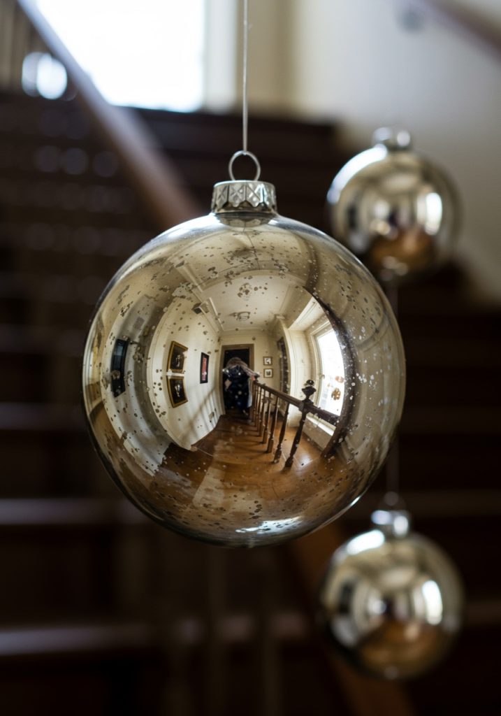 A vertical ornament cascade creates movement along the stairwell. The shimmer catches light and makes a small foyer feel taller.