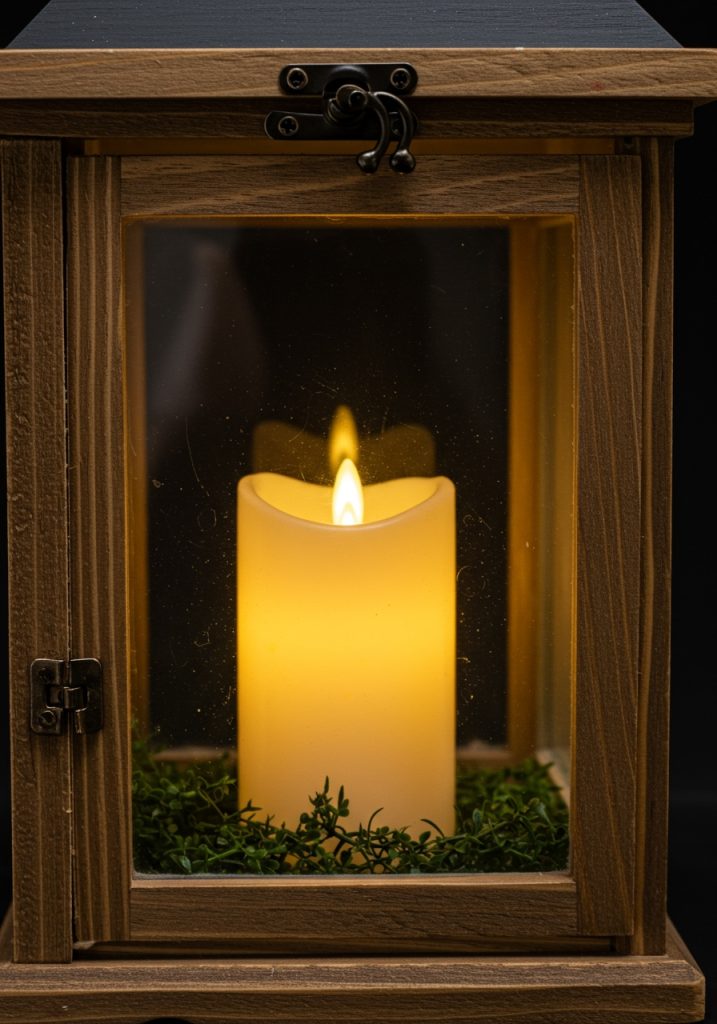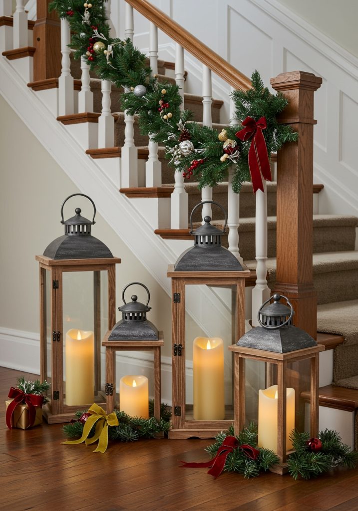 LED candles in metal or wood lanterns give a charming, old-world glow—especially on landings or along a wide stair ledge.