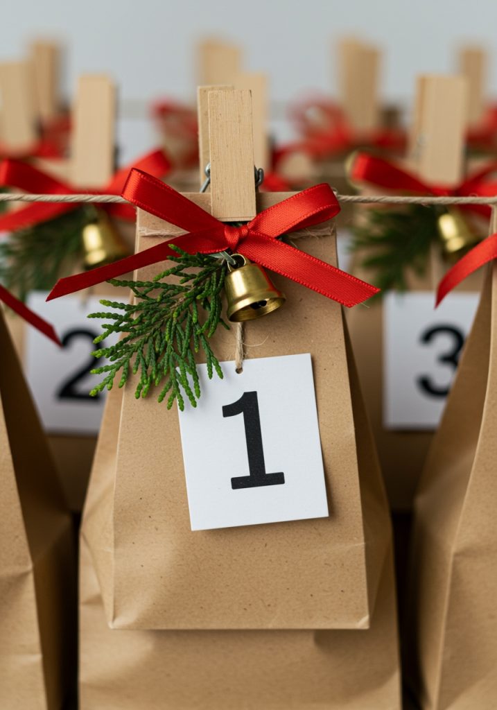 Replace a messy candy calendar with a stair-rail advent: 24 mini bags or boxes clipped along ribbon. It doubles as decor and a daily moment of delight.