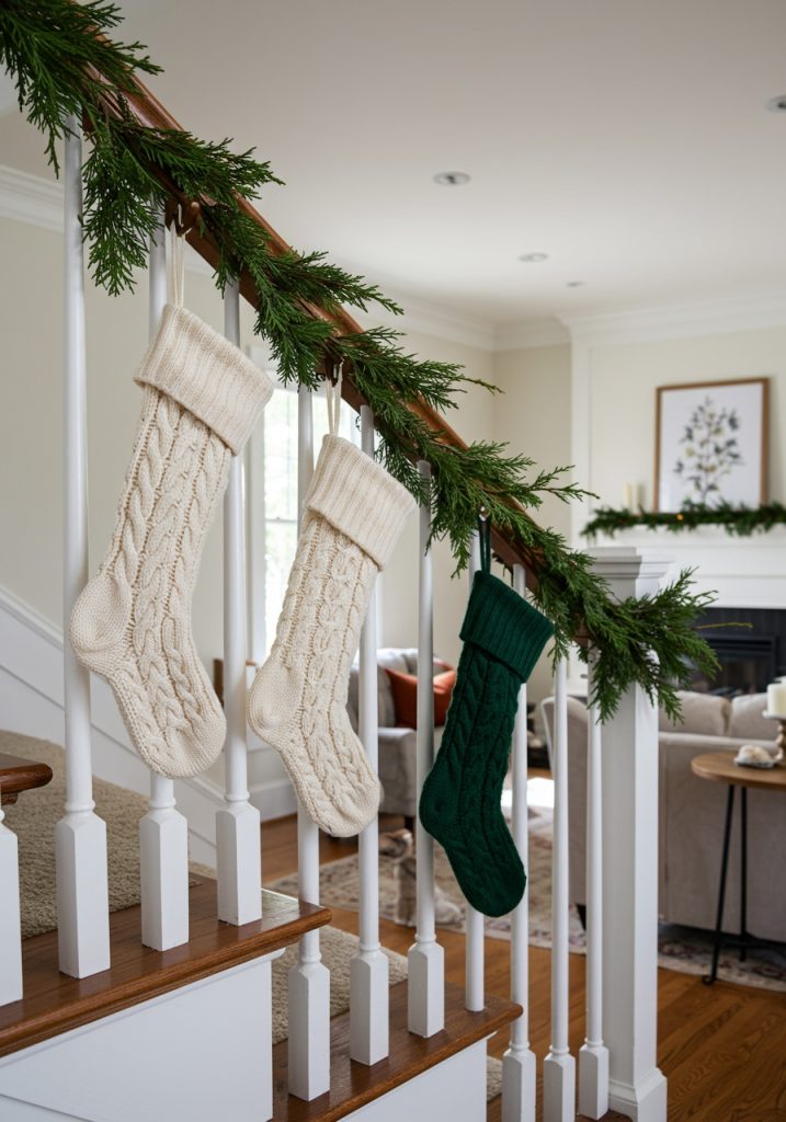 If your living room layout doesn’t allow for a full mantel moment, the stair rail can host knit or cable-knit stockings just as well.