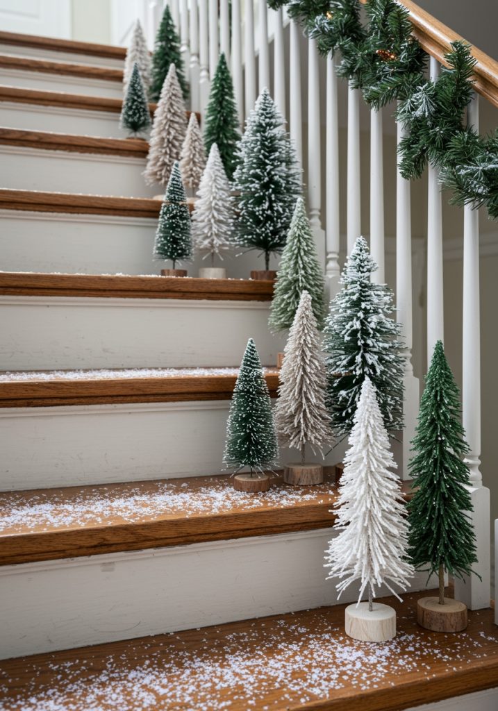 A line of mini tabletop trees (bottle-brush, flocked, or wood) along the outer edge of the stairs feels whimsical and curated.