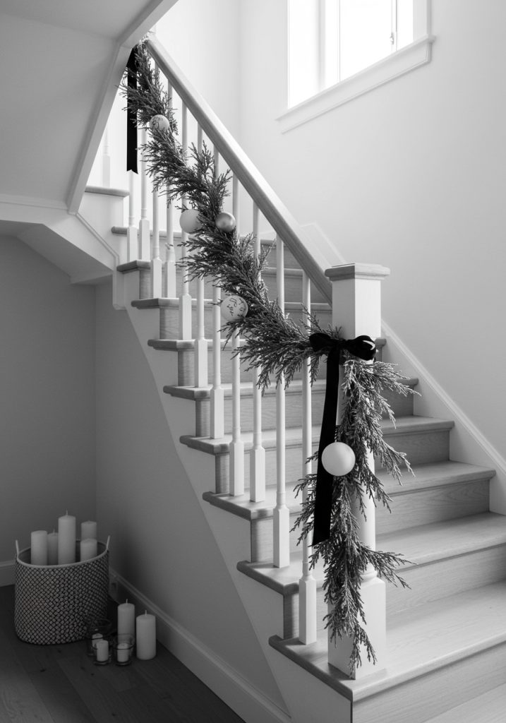 For design lovers who prefer serenity over maximalism, a monochrome banister—think all-black ribbon on deep greenery, or all-white with frosted branches—reads fresh and intentional.
