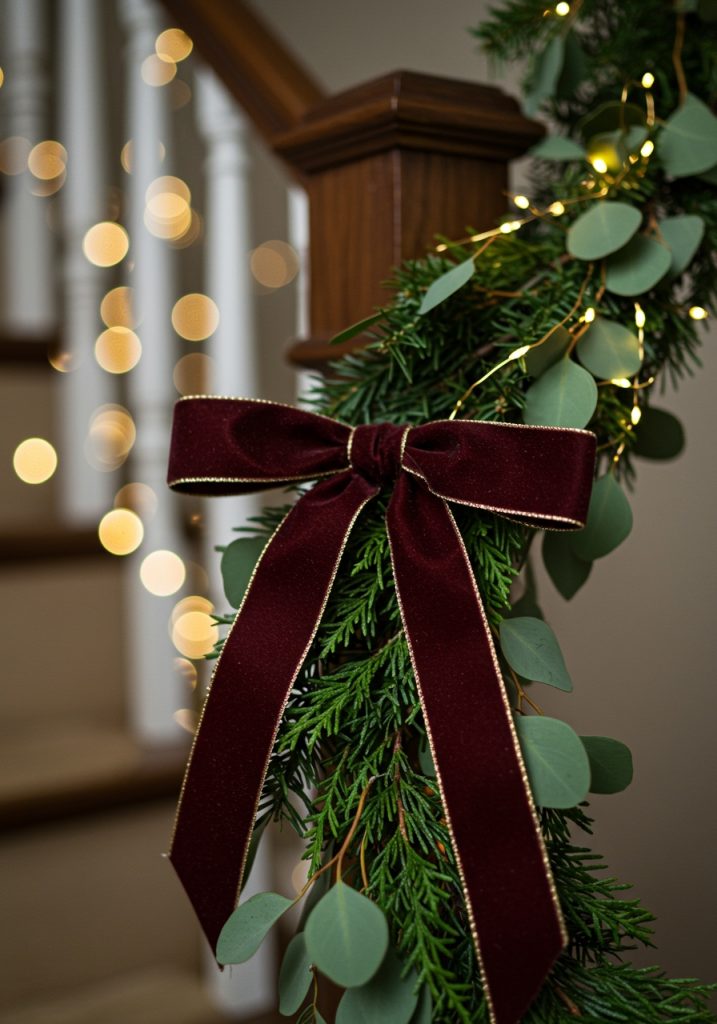 Drape the garland along the banister in a loose swag, secure at posts, and tie velvet bows where it dips. Tuck eucalyptus for movement. Keep the palette tight (e.g., emerald + champagne) to feel elevated.