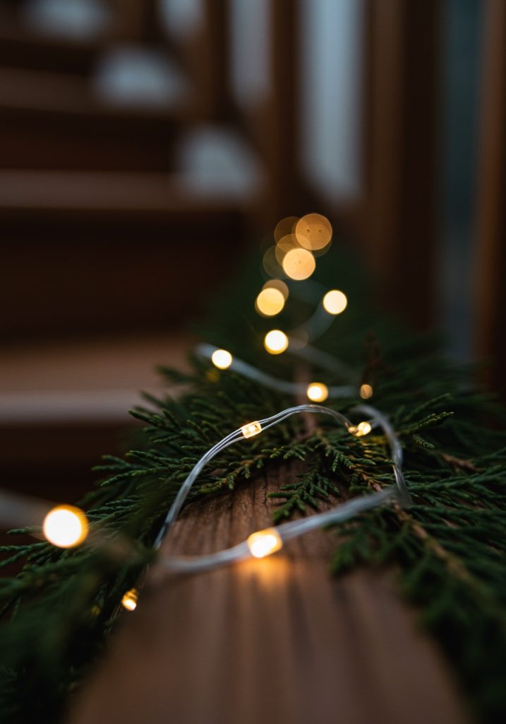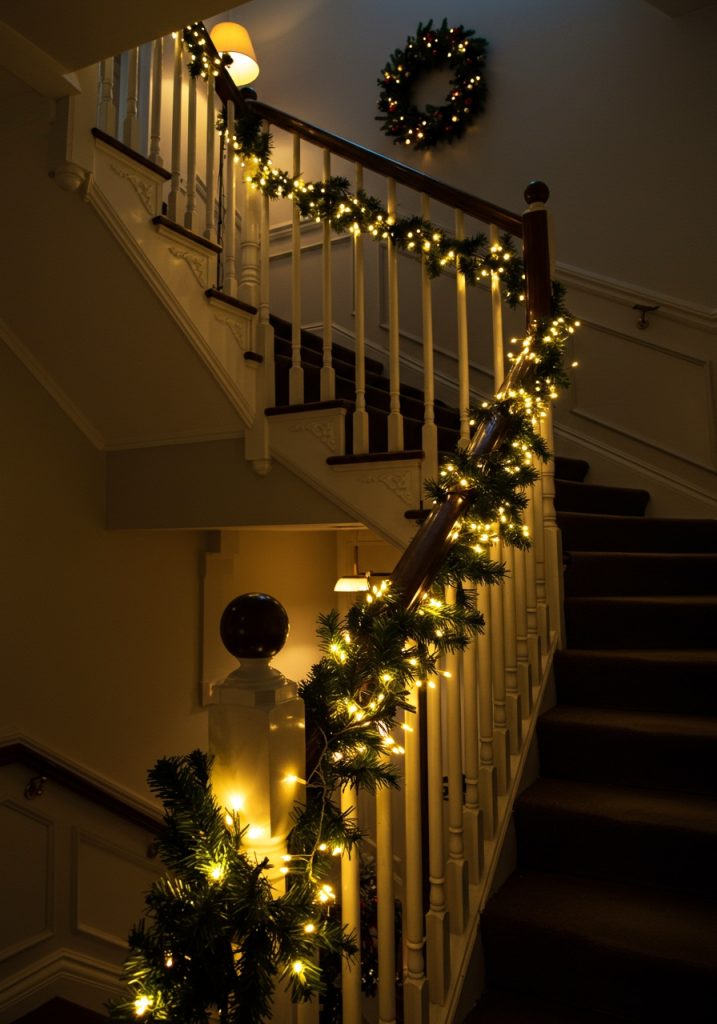 Battery fairy lights or plug-in micro-LEDs turn the staircase into a literal runway for Santa. The warm glow feels magical at night and forgiving in low winter light.