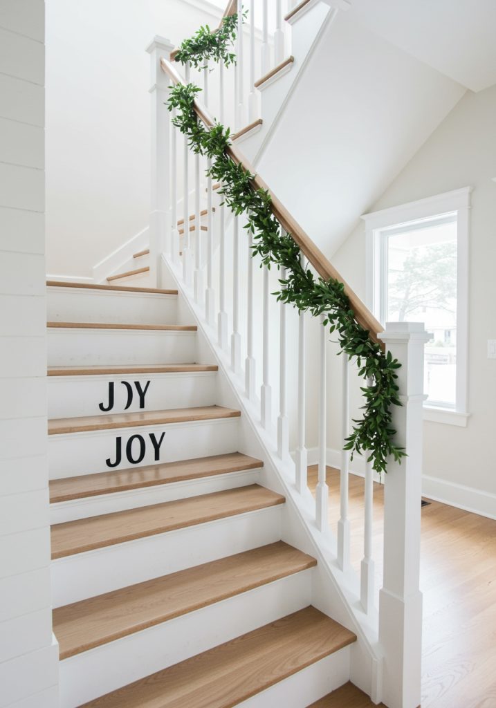Stair riser decals or painted letters spell out seasonal words (JOY, NOEL, MERRY) without eating any walking space. Graphic, clean, and wildly Instagrammable.