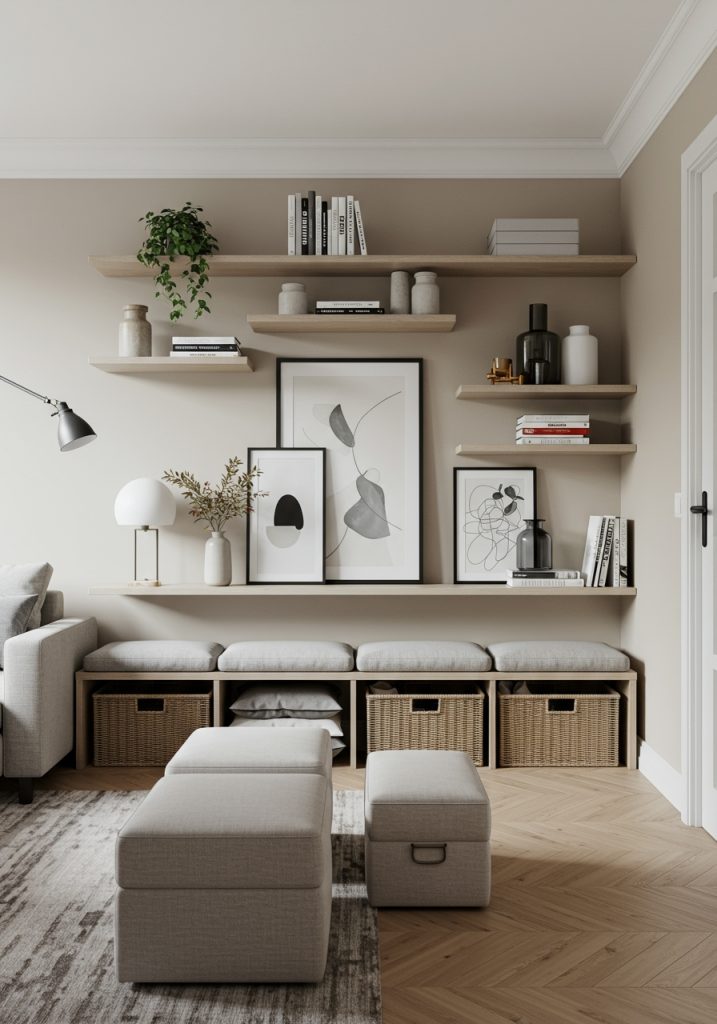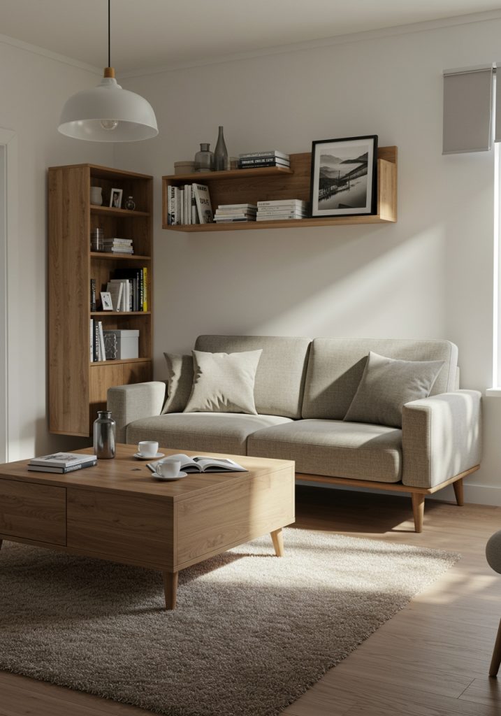 Install floating shelves to store books, plants, or decorative items. This will free up floor space while keeping your living room organized. Wall-mounted TV stands or floating consoles are also great ways to reduce the visual bulk of traditional furniture.