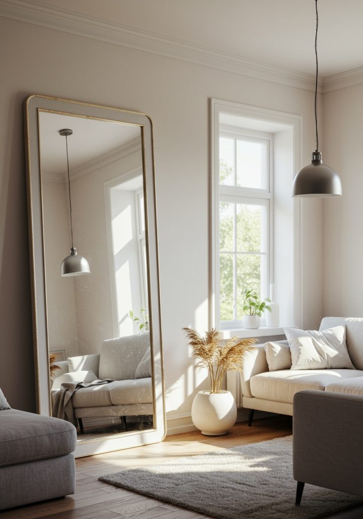 Position a large mirror across from a window to maximize natural light. The mirror will reflect the sunlight, brightening up the entire room. This not only makes your living room feel more spacious but also brings in a cozy, inviting glow.