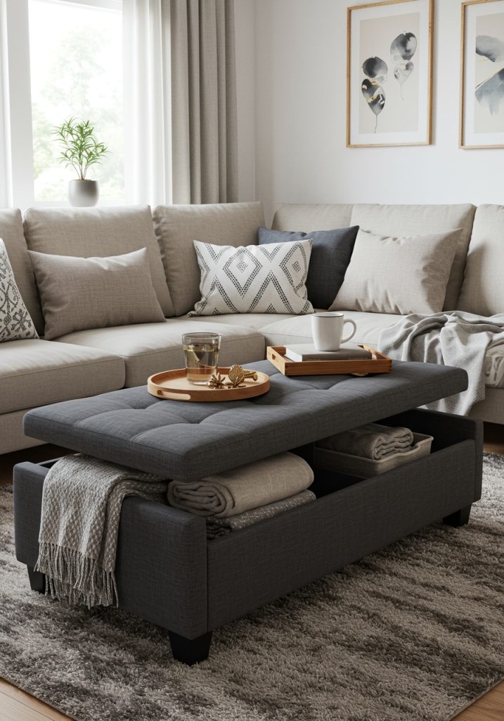An ottoman can double as a coffee table or a footrest, but it can also be used to store extra blankets, pillows, or magazines. This adds extra functionality to your living room without adding clutter.