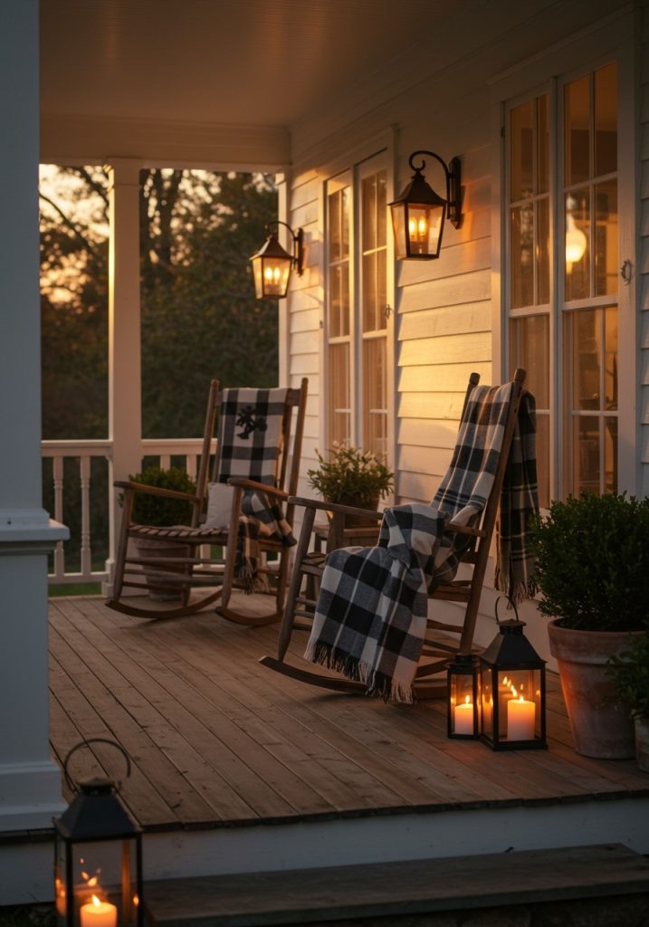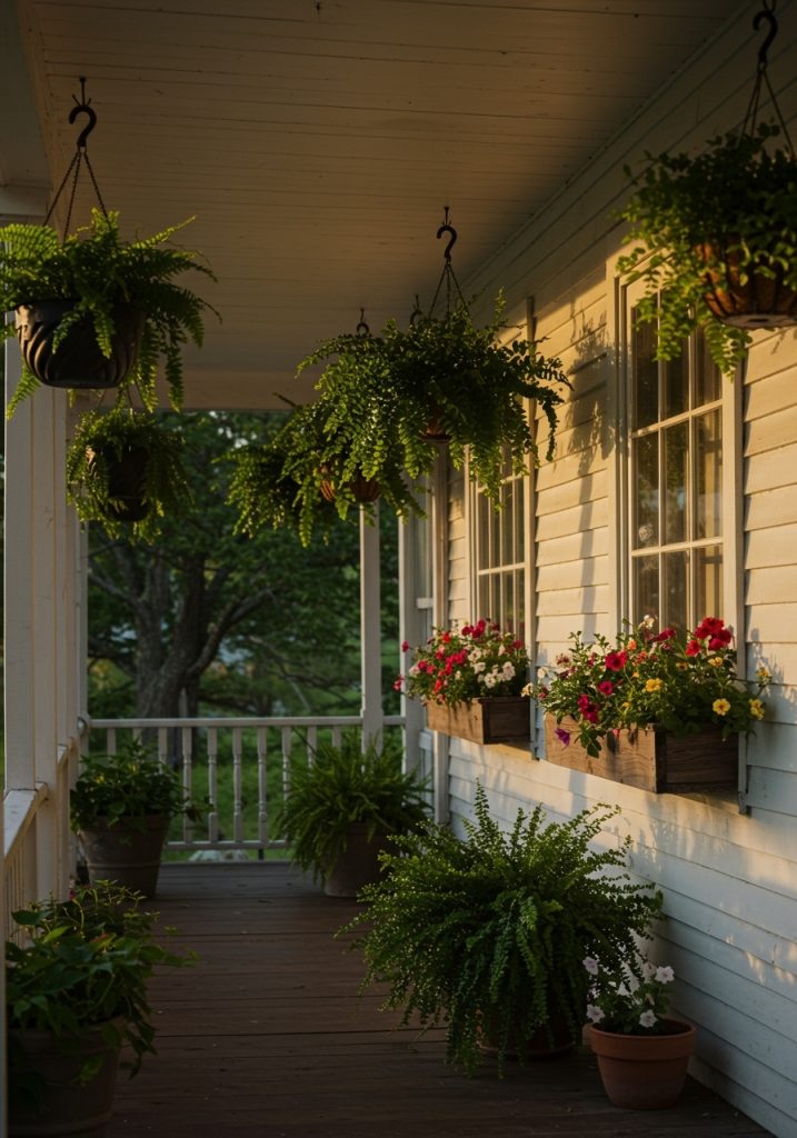 Don’t just decorate the floor—draw the eye up! A pair of lush hanging baskets overflowing with ferns or petunias adds instant life and color. If you have windows facing the porch, window boxes are a classic, charming addition.