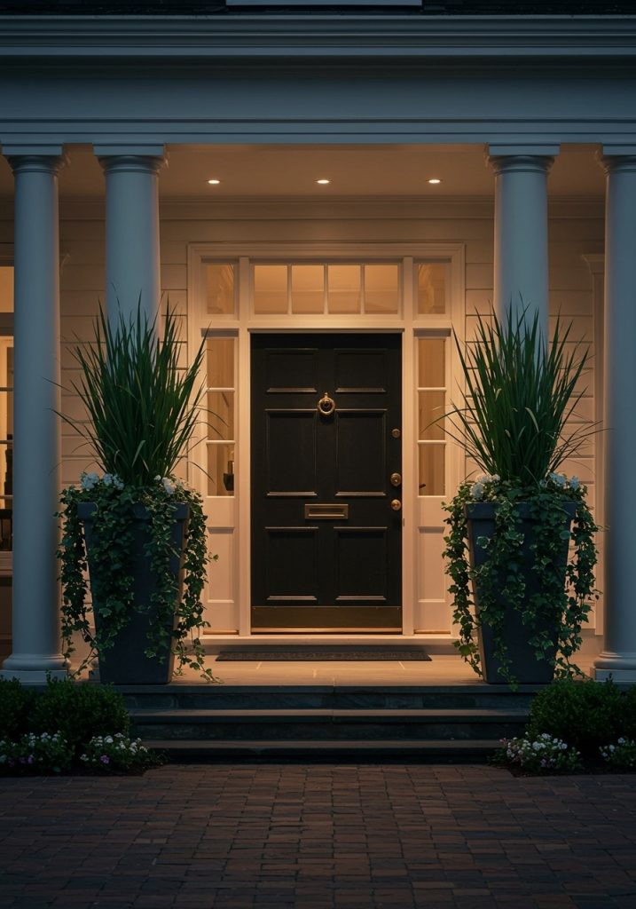 The easiest way to make a grand entrance is with symmetrical planters. Place two large, identical planters on either side of your front door. Fill them with tall plants (the “thriller”), bushy plants (the “filler”), and trailing plants (the “spiller”).