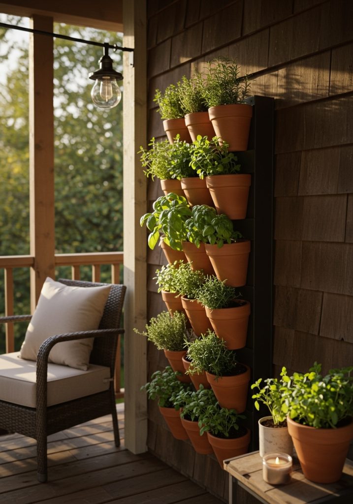 My new favorite thing! This is especially great for smaller porches. Mount a few small pots or a planter system on the wall and grow your own herbs—rosemary, mint, basil, and thyme are super easy. It looks beautiful, smells amazing, and is practical for cooking. It’s one of the best home garden ideas you can implement in a small space.
