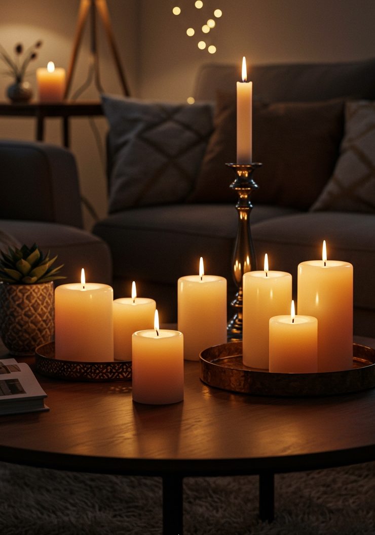 Candles are a must for cozy vibes. Choose a few in different heights, or go for a statement candle in a bold color. If your living room needs more light, consider a stylish table lamp or even fairy lights.
