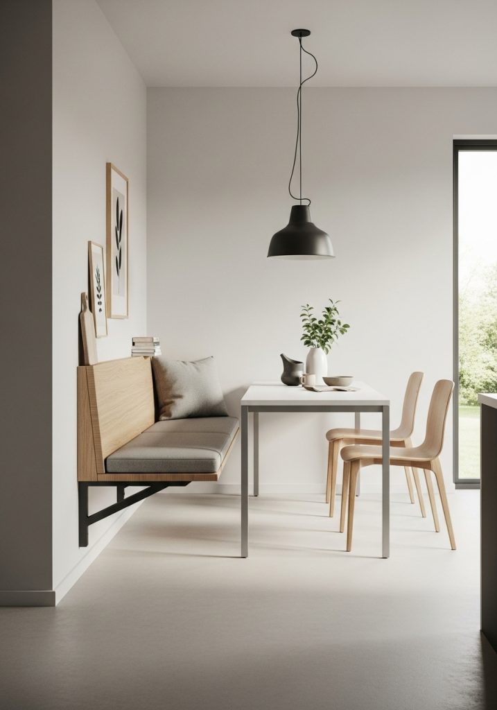 Don’t have a corner? No problem. A straight bench along a single wall works wonders. We call this the “floating bench” look. Pair it with a rectangular table and a couple of chairs on the opposite side, and you have a streamlined setup that keeps traffic lanes open.