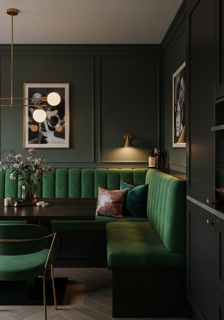 Who says kitchens have to be white and bright? Upholster your banquette in rich velvet—think emerald green or navy blue. It adds a layer of sophistication that feels more like a cocktail lounge than a breakfast spot.