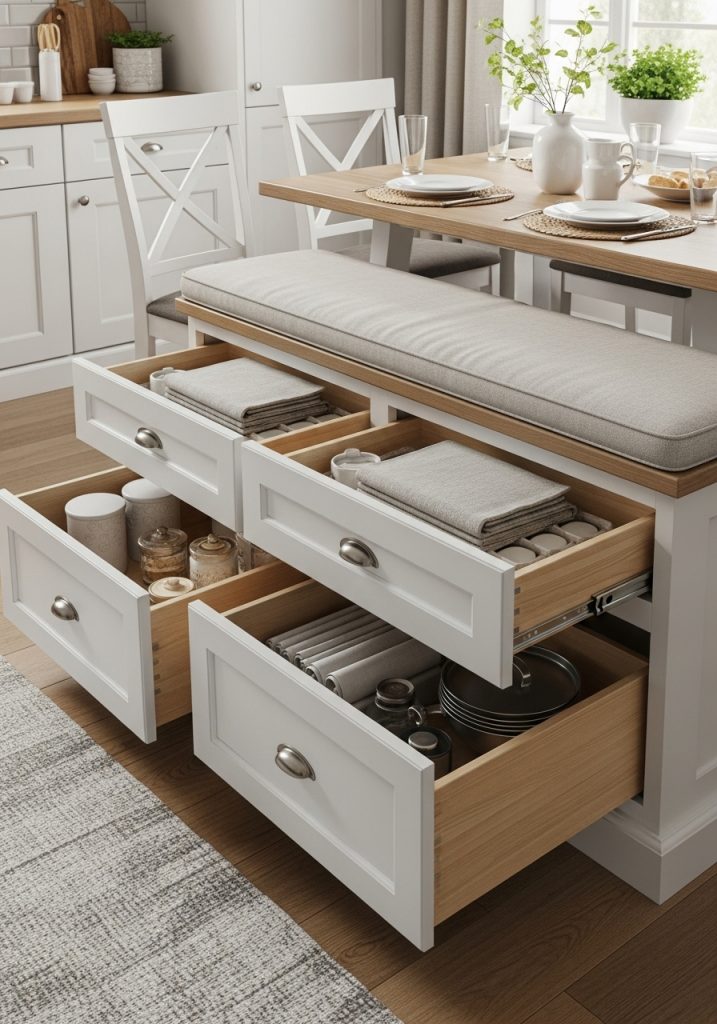 If lifting heavy cushions sounds annoying (and honestly, it can be), go for drawers installed in the base of the bench. They are much easier to access for everyday items like placemats or kids’ craft supplies.