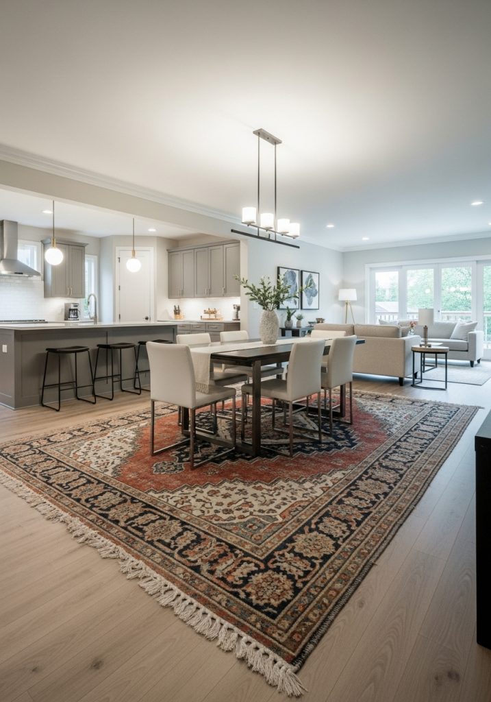 Many modern homes have open-concept floor plans where the dining “room” is really just a zone between the kitchen and the living area. A rug is essential for anchoring that space and saying, “Hey, this is where we eat.”